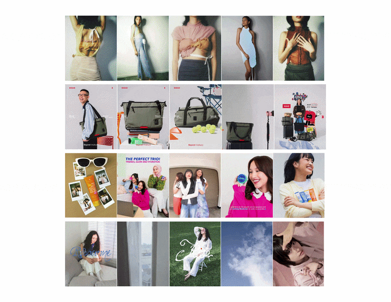 top-bottom: creative production for kallarona (2020-2021), set & fashion styling for bagasi destinasi (2024), creative direction for emina cosmetics daily content (2024-2025), producer for hgl house (2025) various campaigns 'retourne', 'rise', and 'cupid kiss'